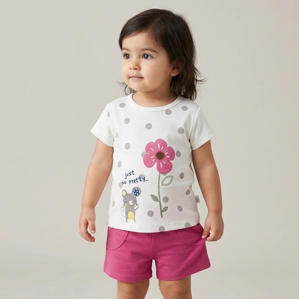 This charming 2-piece outfit features a soft cotton short-sleeve t-shirt with playful polka dots and a cute flower graphic, alongside a tiny mouse illustration with the sweet message “Just So Pretty…”.