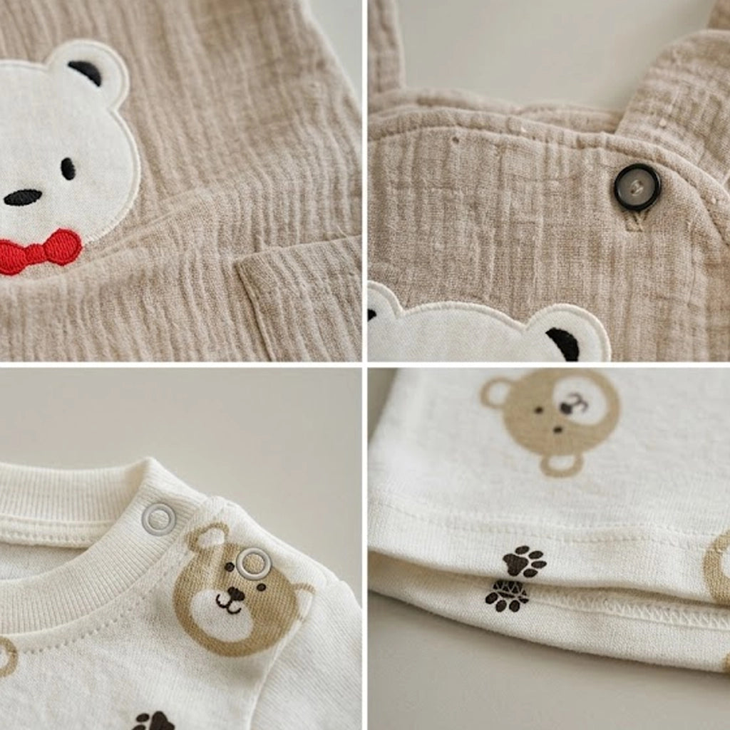 The overalls feature a relaxed "bubble" silhouette, perfect for accommodating diapers without restricting leg movement. We’ve added "bear ear" accents to the straps and a plush bear appliqué on the chest to capture that timeless "nursery" aesthetic.