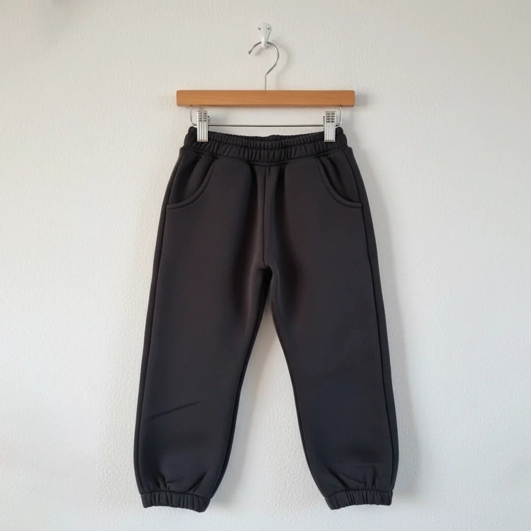 أما البنطلون فهو معمول من قماش سميك ومرن ببطانة داخلية ناعمة، بيدي دفء من غير ما يقيّد الحركة. الوسط المطّاط وأساور الرجلين بيوفّروا مقاس ثابت ومريح للأطفال اللي بيحبّوا الحركة.