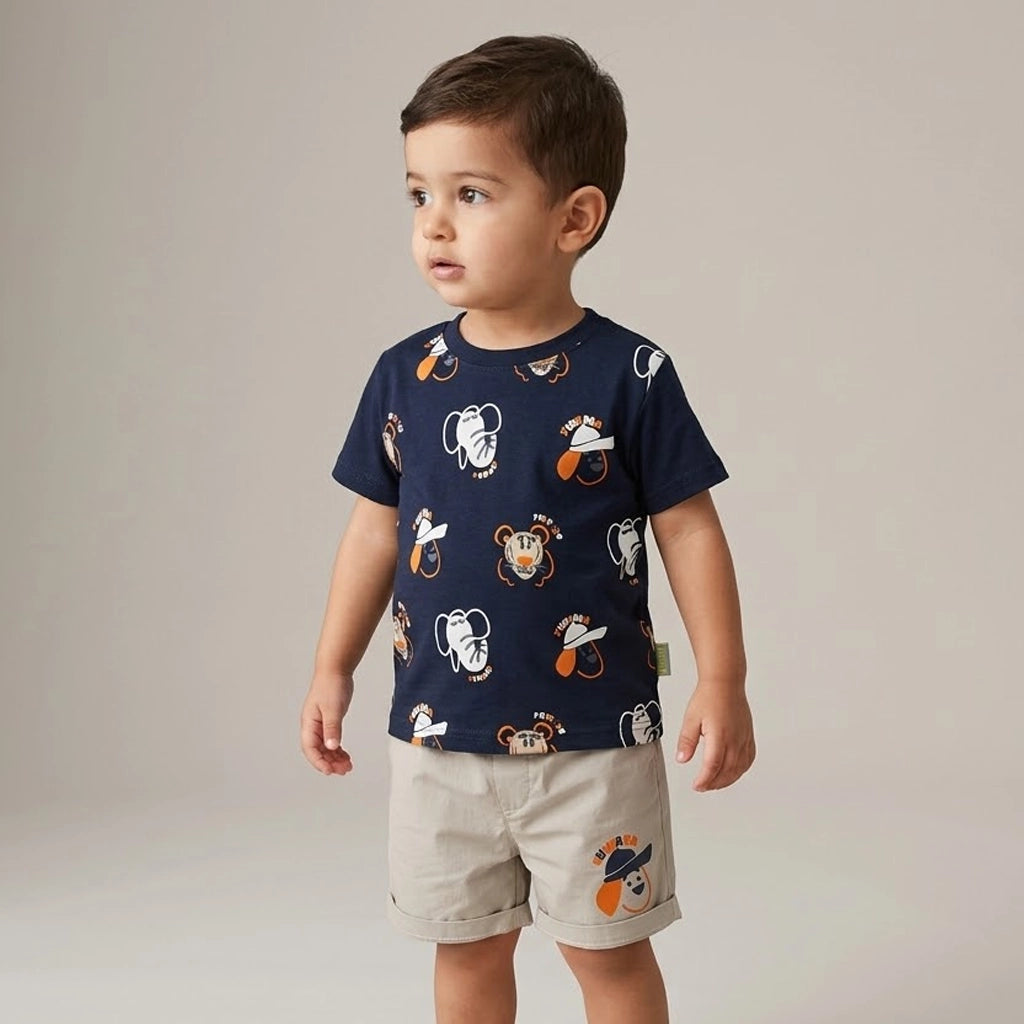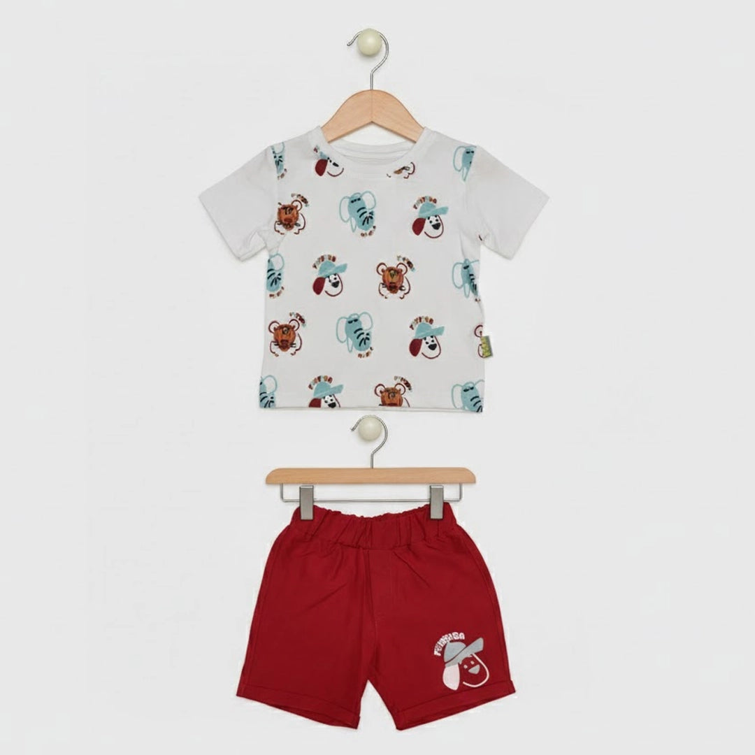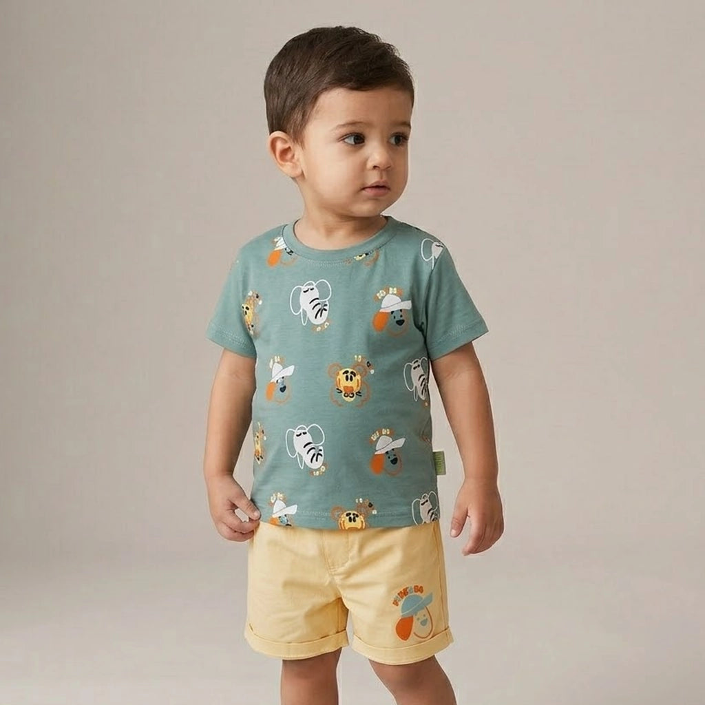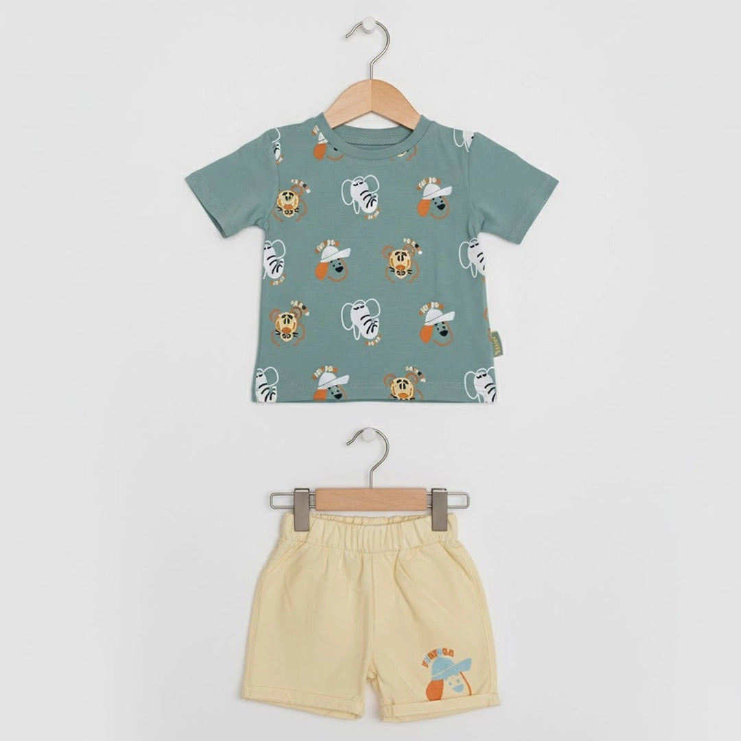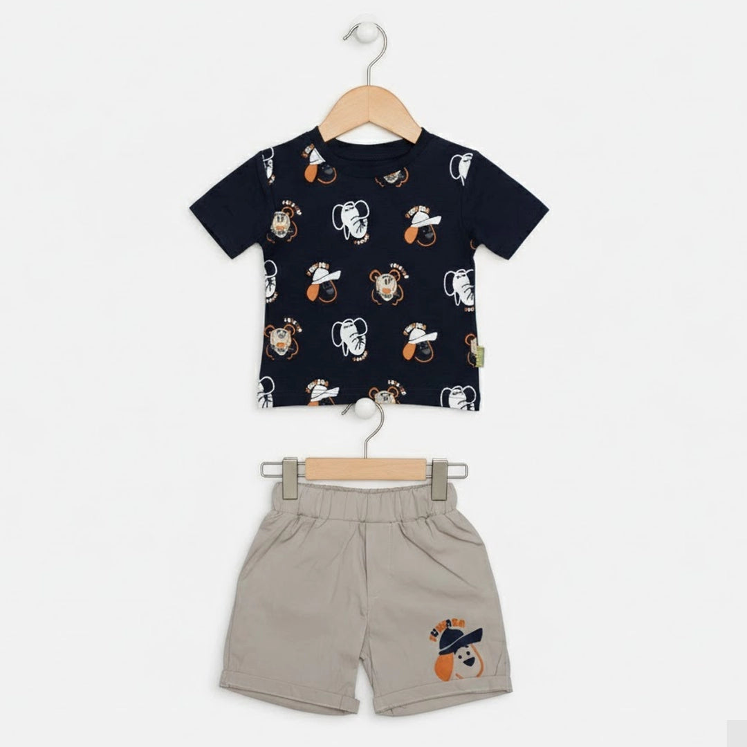 الطقم مكوّن من قطعتين: تيشيرت قطن ناعم برسومات حيوانات سفاري مرحة بتدي طابع مبهج ومغامر على اللوك اليومي، ومعاه شورت متناسق بخامة مريحة وخفيفة تدي حرية حركة كاملة للأطفال النشيطين.