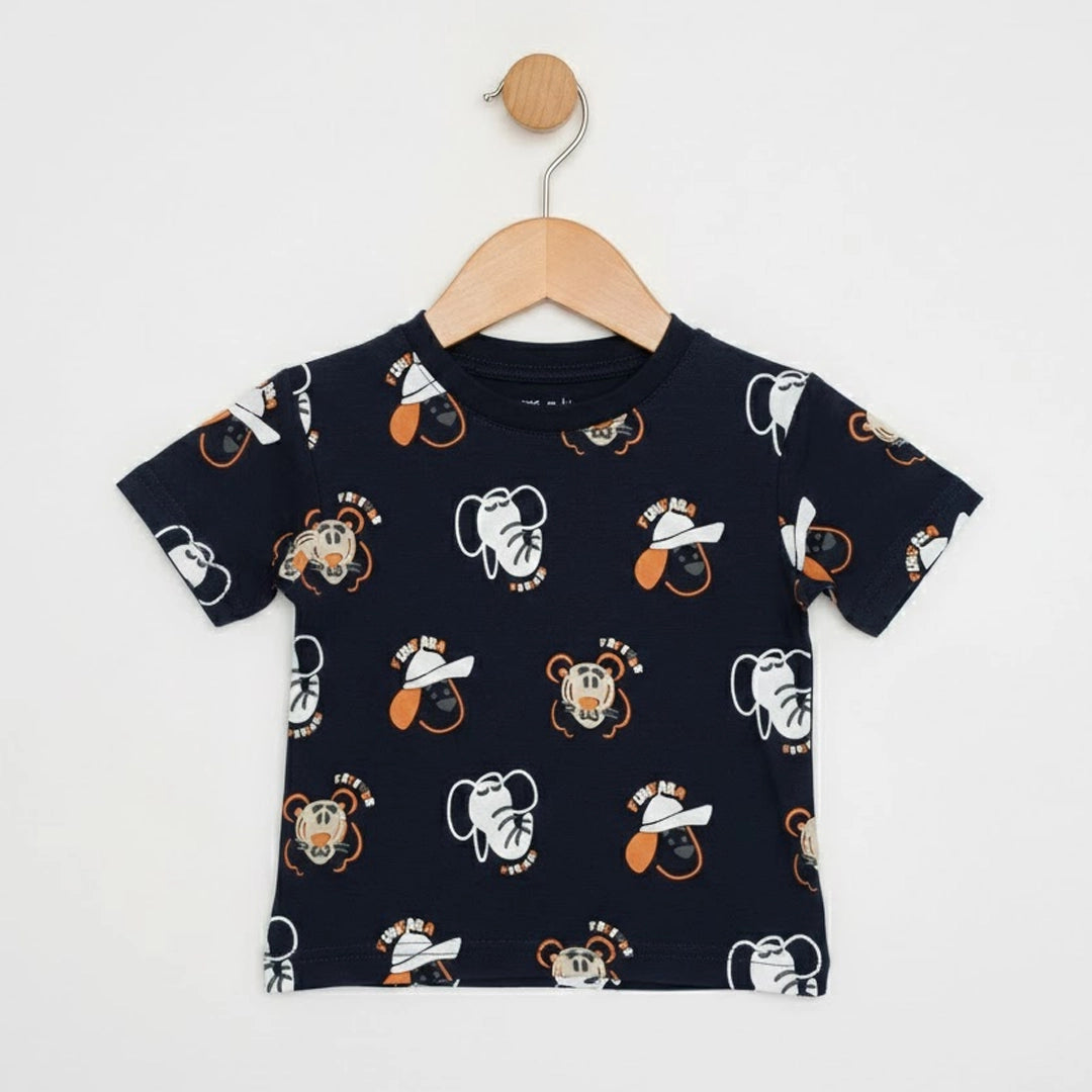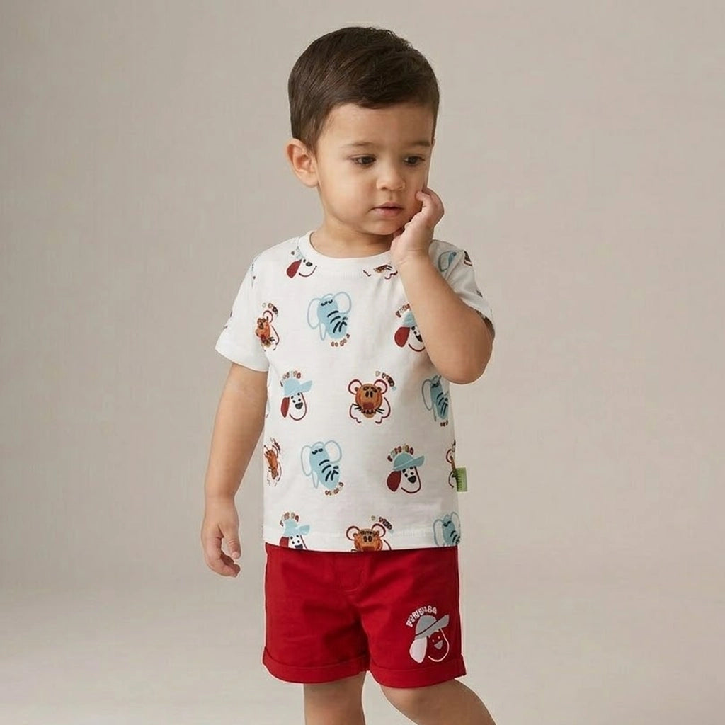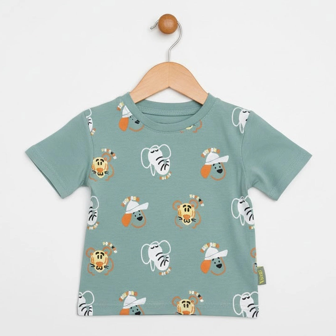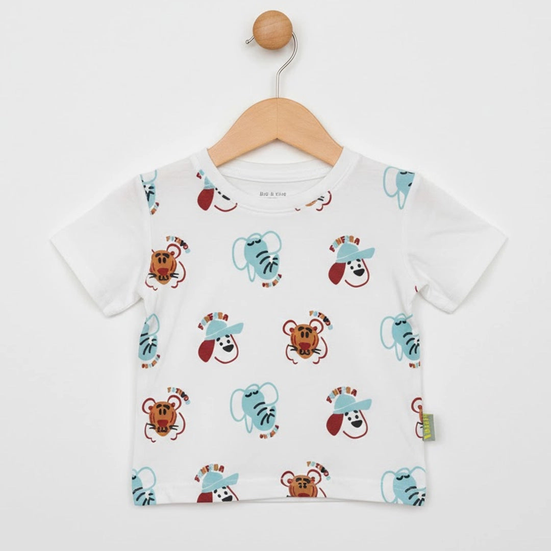 الطقم مكوّن من قطعتين: تيشيرت قطن ناعم برسومات حيوانات سفاري مرحة بتدي طابع مبهج ومغامر على اللوك اليومي، ومعاه شورت متناسق بخامة مريحة وخفيفة تدي حرية حركة كاملة للأطفال النشيطين.
