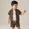 تيشيرت قطن ناعم بطباعة خفيفة “the wild”، وفوقه قميص خفيف بخامة مضلعة بأزرار، مع شورت مضلع بنفس التصميم بوسط قابل للتعديل برباط.
