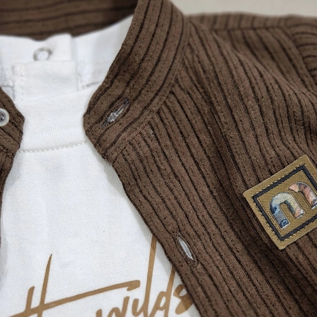 مصنوع من خامة ناعمة تسمح بتهوية كويسة، كل قطعة مصممة علشان توفر راحة وحركة بحرية للطفل طول اليوم. الألوان الترابية الهادية مع الخامة المضلعة بتدي شكل راقي وسهل التنسيق، مناسب للخروجات أو الاستخدام اليومي.