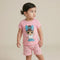 This adorable 2-piece outfit includes a soft cotton t-shirt featuring a stylish doll graphic with oversized sunglasses and a bow, paired with matching printed shorts for a coordinated summer look.