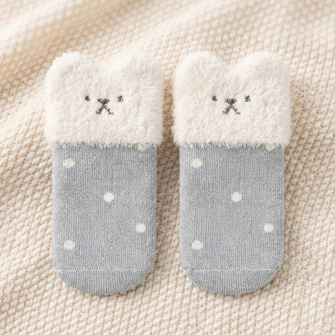 Each pair features a cuddly bear-face cuff made from plush, fuzzy fabric that sits gently against your baby’s skin. The lower sock is crafted from a soft, flexible knit with cute dotted details, offering a snug yet comfortable fit without slipping.