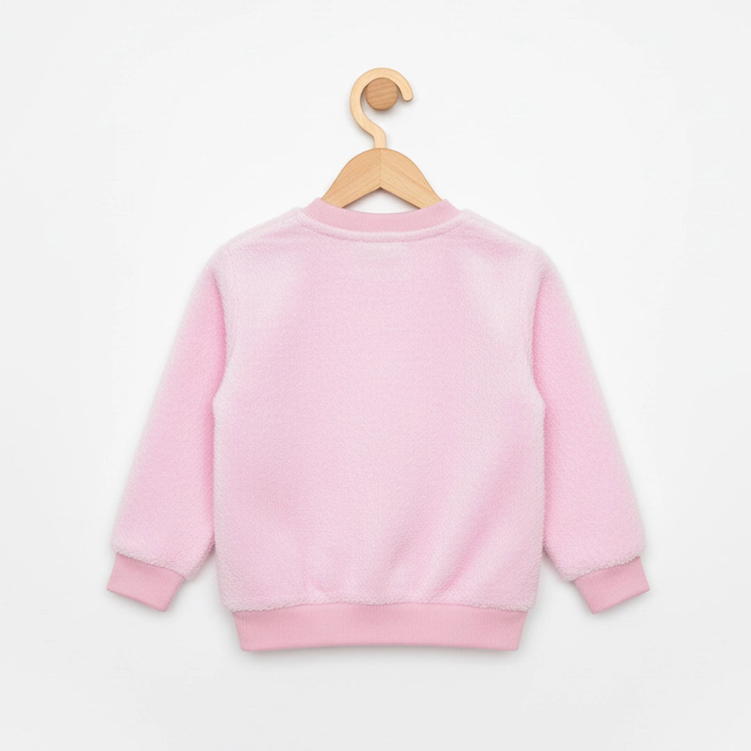 • A fluffy pink fur sweater featuring a bold Hello Kitty embroidered design inside a heart.