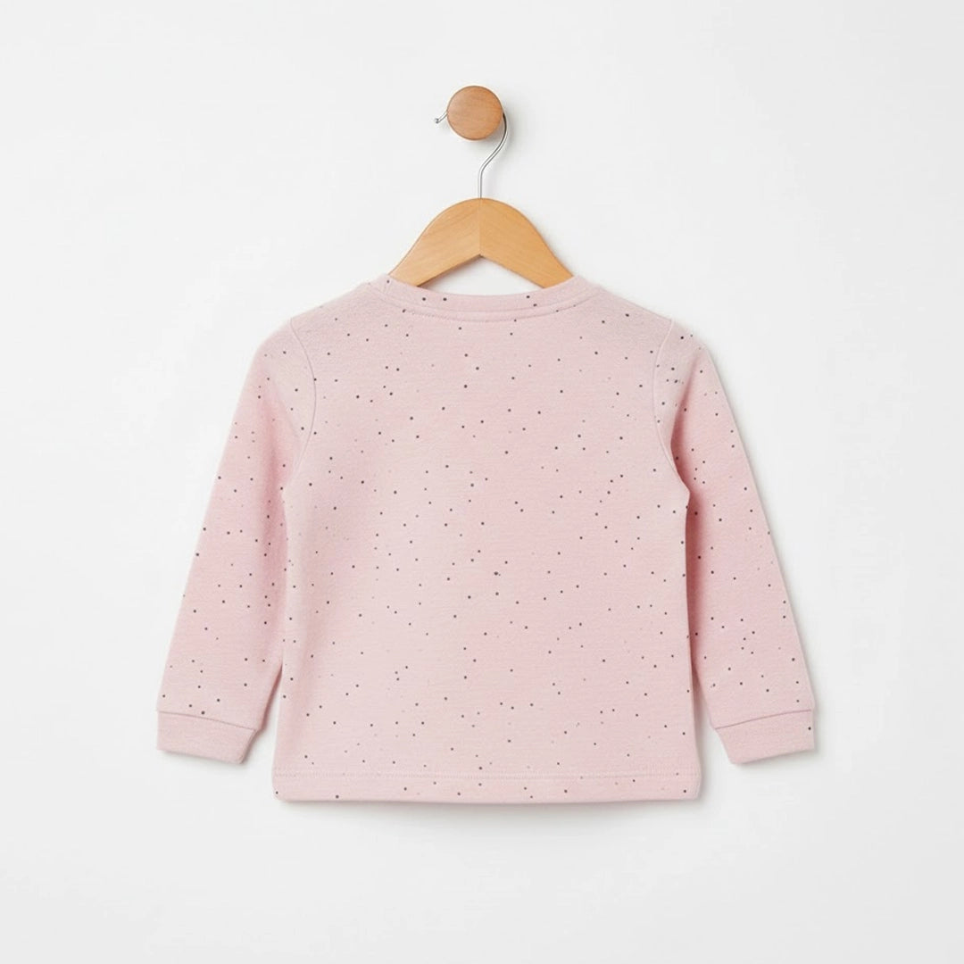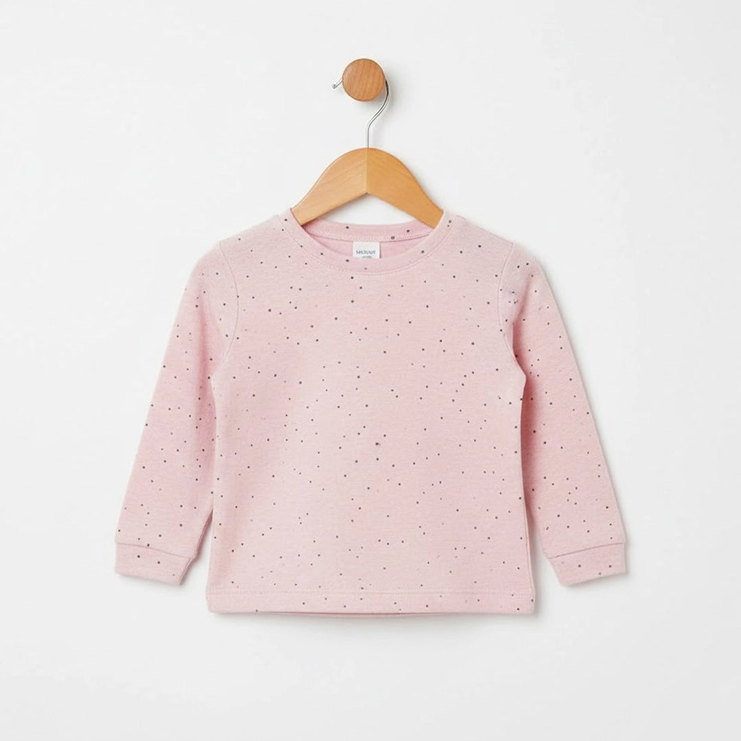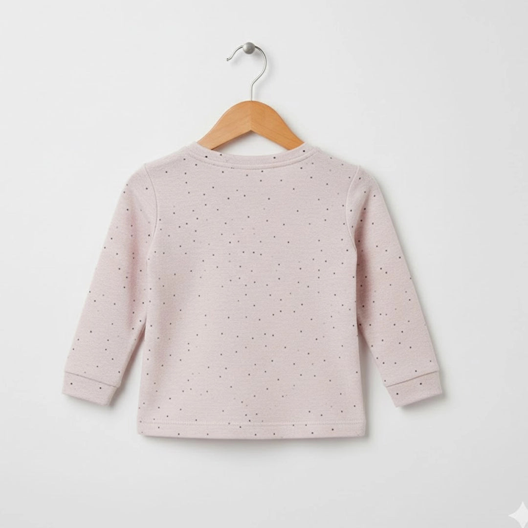 This two-piece set includes a long-sleeve top and matching pants, crafted from soft, breathable cotton that feels gentle against delicate skin. The subtle dotted print adds a timeless, minimal look while keeping the focus on comfort and practicality.